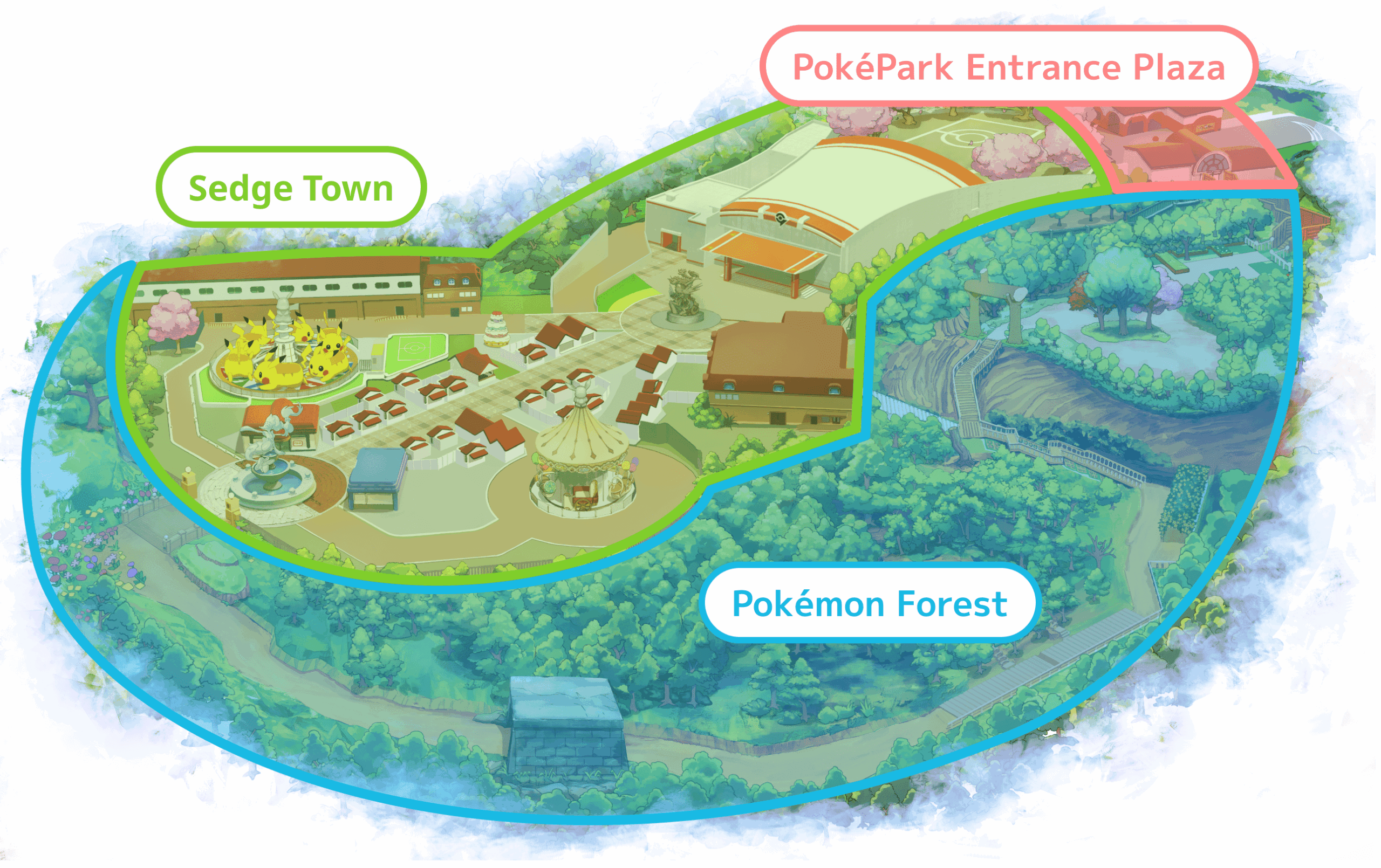 PokéPark Kanto sera divisé en deux zones principales: Pokémon Forest et Sedge Town. Dans Pokémon Forest, les visiteurs pourront déambuler sur un sentier parsemé de statues grandeur nature représentant des Pokémon de toutes les générations, recréés dans leurs habitats naturels. Et malgré son nom, le parc ne se limitera pas aux créatures de la région de Kanto: les fans pourront y croiser bien d’autres espèces emblématiques.